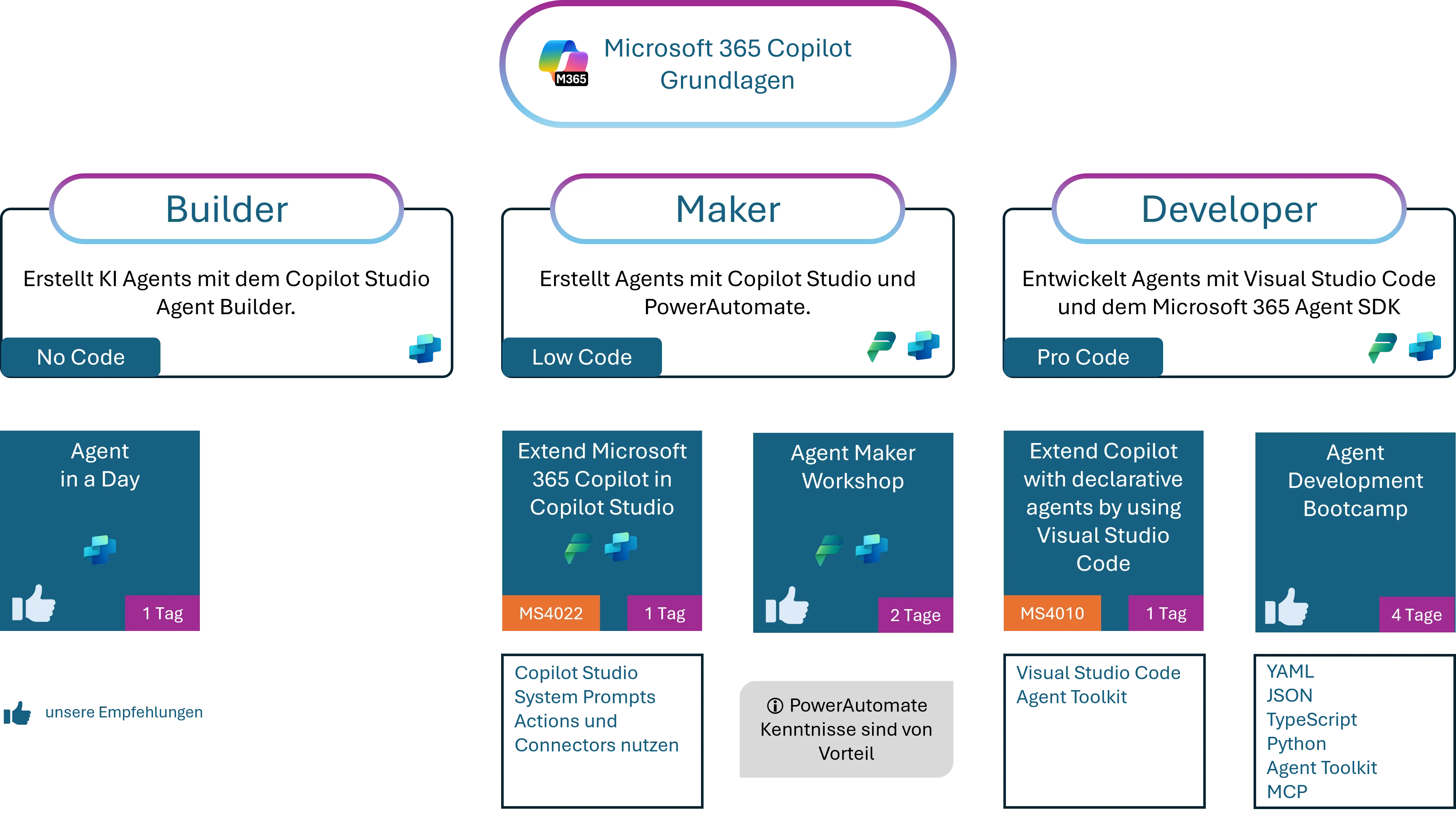 In diesem Seminar erlernen Sie strukturiert Copilot Agents imperativ und deklarativ und mittels Pro-Code Technologien zu entwickeln und zu verteilen. Sie erlernen die Agent Deklaration mit YAML und die Entwicklung von Agents mittels TypeScript und JSON. Außerdem erstellen Sie MCP Server mit dem Model Context Protokoll und Nutzen MCP und das Graph API für den Zugriff auf M365 Daten.