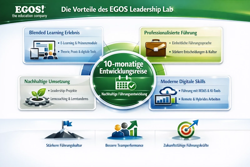 Dieses 10‑monatige Leadership-Programm stärkt Führungspersonen gezielt in ihrer Rolle und verbindet Theorie, Praxis und digitale Umsetzung. Das Blended-Learning-Format kombiniert E‑Learning, Präsenzmodule sowie digitale Lernräume zu einer modernen, wirksamen Führungsentwicklung.